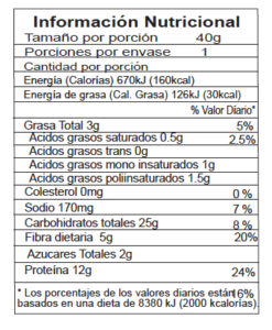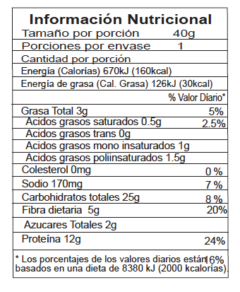 Aporta 24% (12g) de Proteína y 20% (5g) de Fibra del Valor Diario Recomendado (VDR)