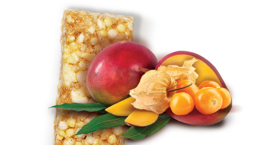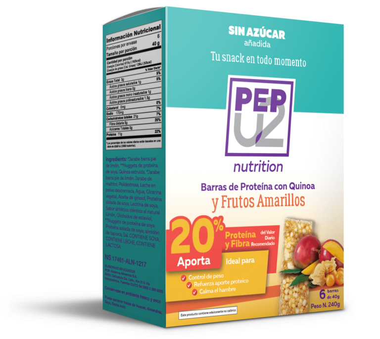 Ingredientes: *Jarabe barra frutos amarillos, **Nuggets de proteína de soya, Quínoa extruida, uvilla deshidratada, mango deshidratado. *Jarabe barra frutos amarillos: Jarabe de maltitol, Polidextrosa, Agua, Glicerina vegetal, Aceite de girasol, Proteína aislada de soya, Lecitina de soya Sabor sintético idéntico al natural maracuyá, Glicósidos de esteviol, **Nuggets de proteína de soya: Proteína aislada de soya, almidón de tapioca, Sal. CONTIENE SOYA